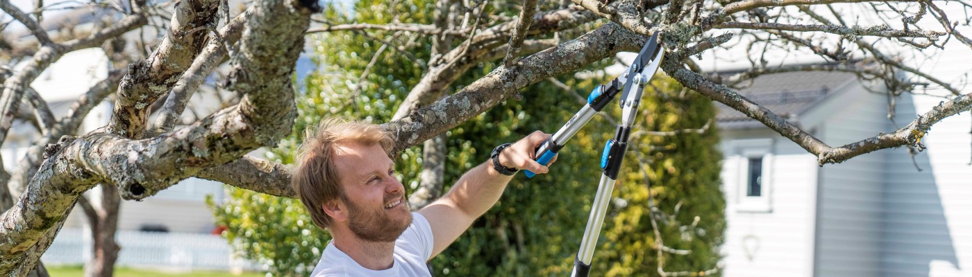 Klipp med diagonal snittflate, slik at du reduserer risikoen for muggangrep. Du kan styre grenenes retning ved å legge snittet rett over en ny knopp som vokser i den retningen du ønsker. Pass også på å fjerne greiner som vokser innover i treet, og greiner som gnisser mot hverandre. Bruk en grensag til tykkere greiner. For de litt tynnere greinene kan du bruke en grensaks. Til slutt kan du fjerne stammeskudd og rotskudd, siden disse stjeler energi fra treet. Rengjør verktøyet etter bruk. Da holder det lenger, og det er klart til bruk den neste gangen du trenger det.