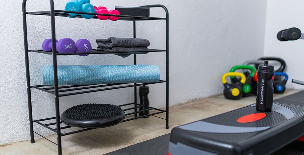 Som oppbevaring til vekter, matter, håndklær og annet treningsutstyr kan det være lurt å anskaffe en stødig hylle. Dette kan du også bygge selv av materialer fra oss.