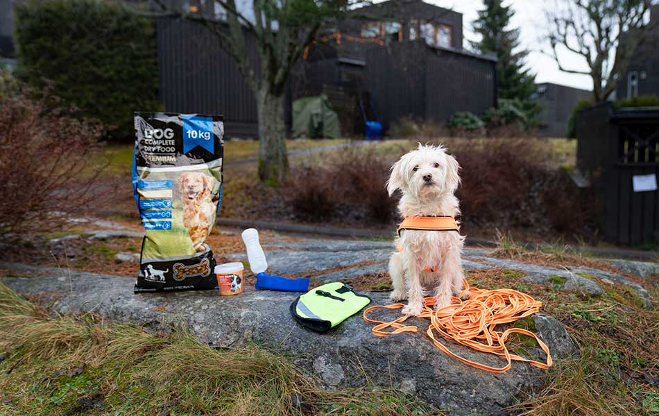Noe ekstrautstyr som kan være praktisk på de litt lengre turene: Sammenleggbar mat- og vannskål, eller vannflaske med tilkoblet skål. En kløvveske med romslige oppbevaringslommer med spenner er fint for jakt og vandringer.