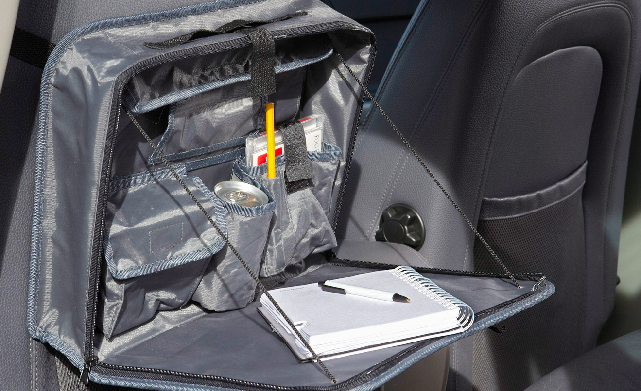 Ikke glem denne praktiske ryggstøtte-lommen. Den kan romme drikkeflasker, nistepakker, tørkepapir, søppelposer og nettbrett. Her får du plass til alt for en ryddig spise-opplevelse i bilen.