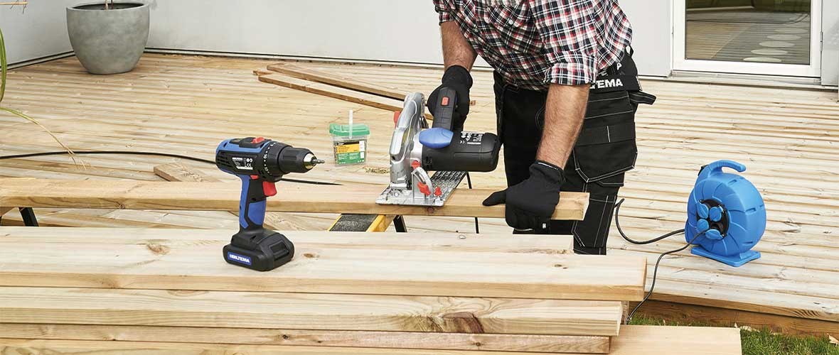 Nå gjenstår den mest fornøyelige delen av jobben, nemlig å skru fast terrassebordene. Du bør bruke to terrasseskruer i hver bjelke. Det kan være lurt å tenke litt på terrassebordene før du kommer til dette punktet – med litt planlegging unngår du nemlig at det siste bordet ender opp som en smal flis.