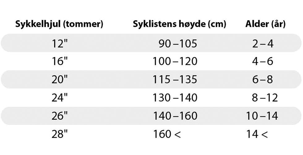 Vi har forskjellige sykkelmodeller som passer til forskjellige bruksområder. Her finner du modeller som passer – uansett om sykkelen skal brukes til og fra skolen eller i skogen. Velg mellom forskjellige farger, størrelser og tilbehør og finn den perfekte barnesykkelen hos oss. Bruk tabellen nedenfor for å finne ut hvilken hjulstørrelse som passer til barnet ditt.
