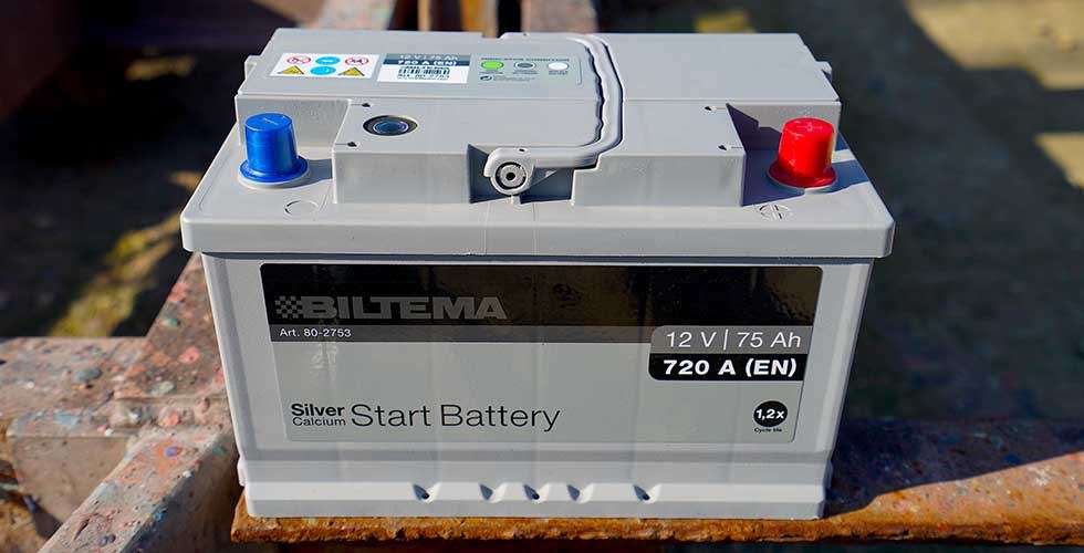 Et batteri på 60–75 Ah er ofte tilstrekkelig for å trekke en jolle opp på en båthenger. Batteriet som du ser på bildet, har et bærehåndtak, slik at det blir enkelt å fjerne det når det skal lades.