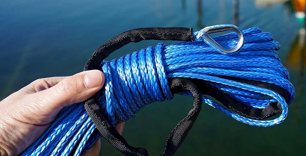 Syntetisk line - Den syntetiske linen på bildet har flere fordeler når den brukes sammen med elvinsjen. Her viser vi en modell på bare 4,8 mm, men som likevel har en bruddstyrke på 1500 kg.