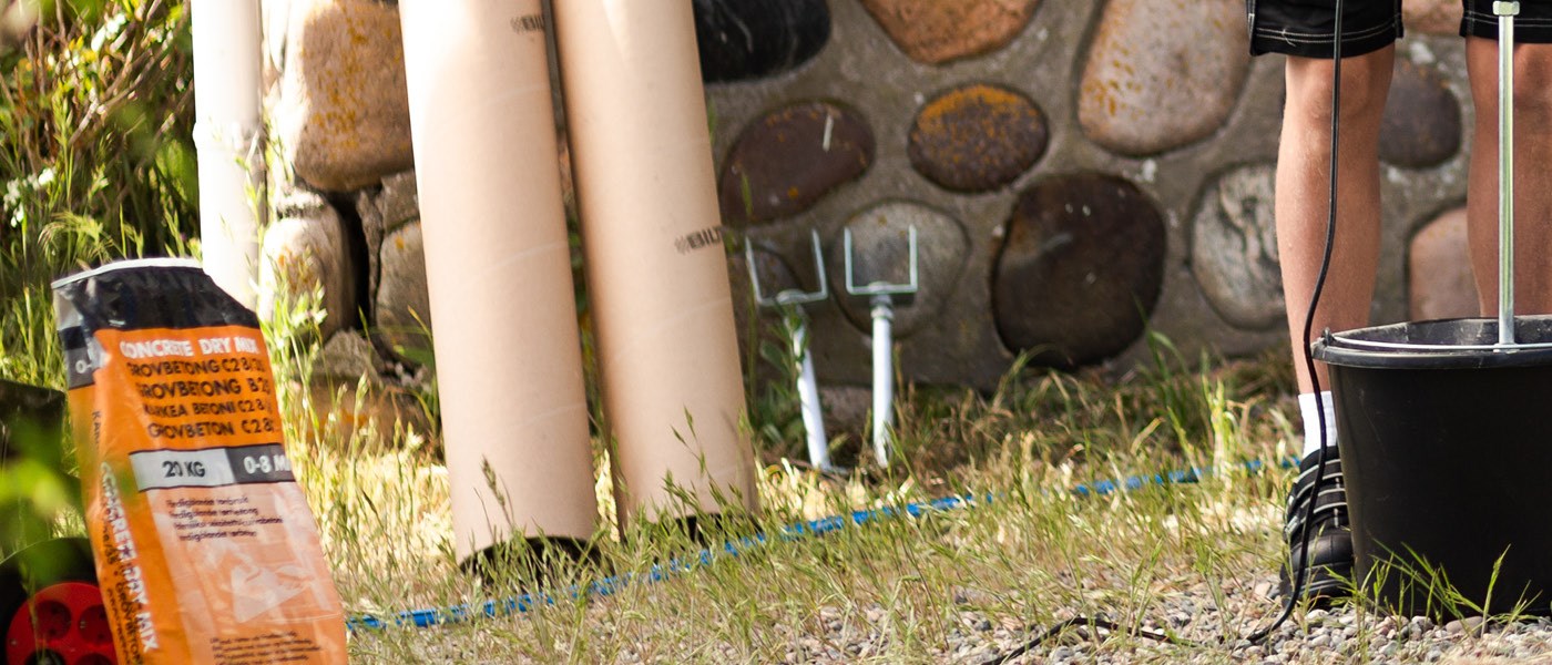 3. Fyll støperøret med betong og rist gjerne litt på det eller rør rundt i betongen underveis for å få ut luftbobler av betongen. For ekstra styrke bør du sette ned et par armeringsjern. Husk at de skal ha minimum 5 cm. overdekning av betong. For å kappe armeringsjernene bør du bruke en vinkelsliper.