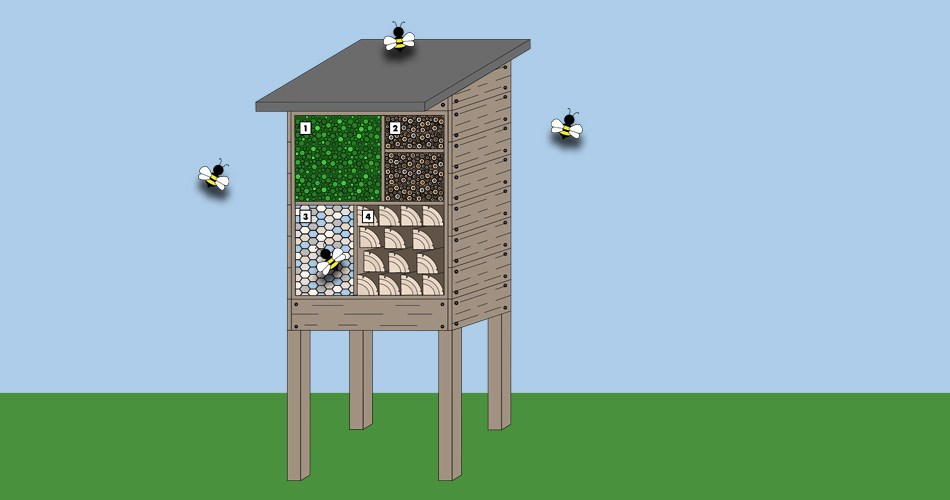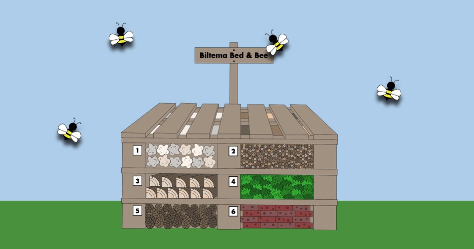 - Materialer til insektene: Rommene i kassen må fylles med materialer som tiltrekker seg de mange ville biene. For eksempel bambusrør, trebiter og greiner samt sand, leire og jord som har blitt knadd sammen, og som tørker når den er plassert. Sørg også for å slipe eller pusse ned de skarpe endene av materialene, slik at biene ikke kan skade seg på dem
