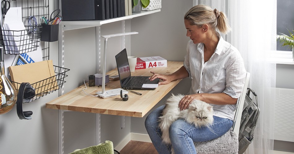 Du kan enkelt lage en rimelig og unik arbeidsstasjon ved hjelp av veggskinner, hyller eller bordplater. Fest et valgfritt antall hylleplater til skinnene, slik at du kan oppbevare viktig kontorutstyr og andre ting du trenger i jobben din.