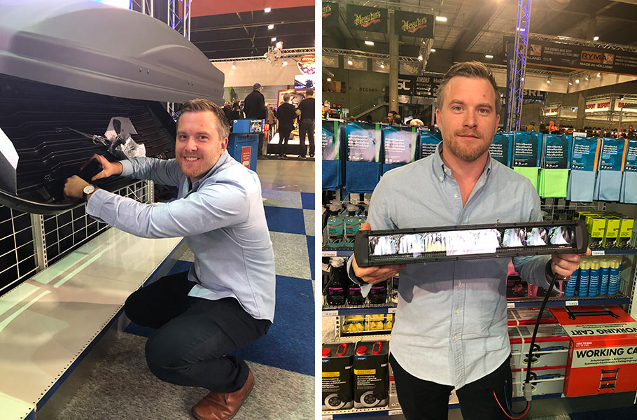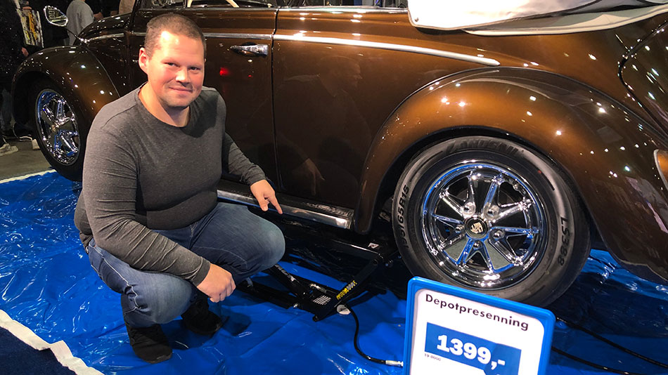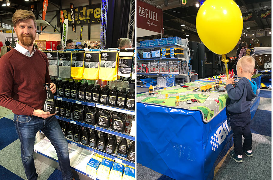 Biltemas produktansvarlige hadde tatt turen til Norge og Oslo Motorshow, og fikk vist frem noen av sine favorittprodukter. Daniel Hansson, produktansvarlig for Bil, viste fornøyd frem vår quick jack og garasjeinnredning.